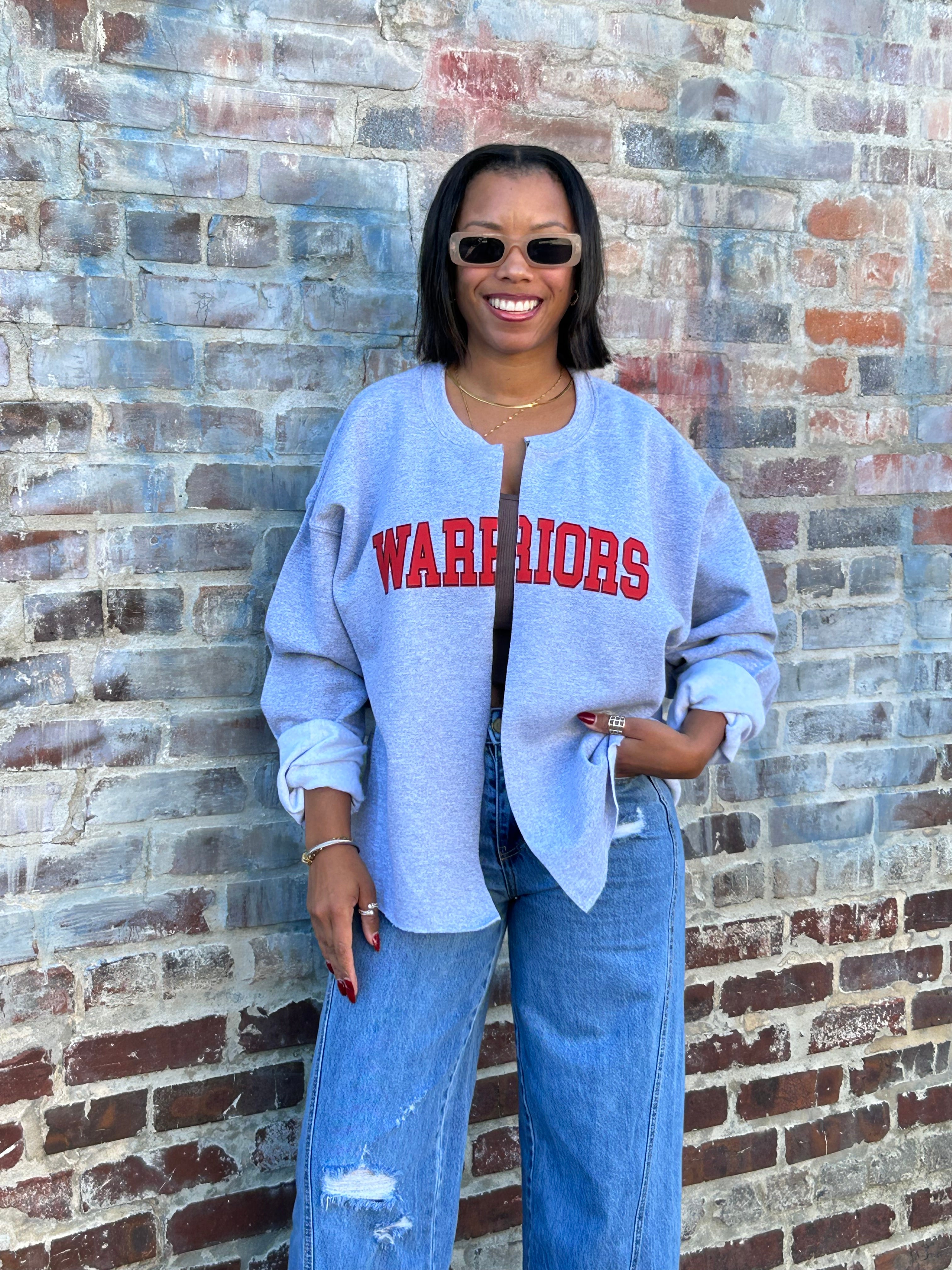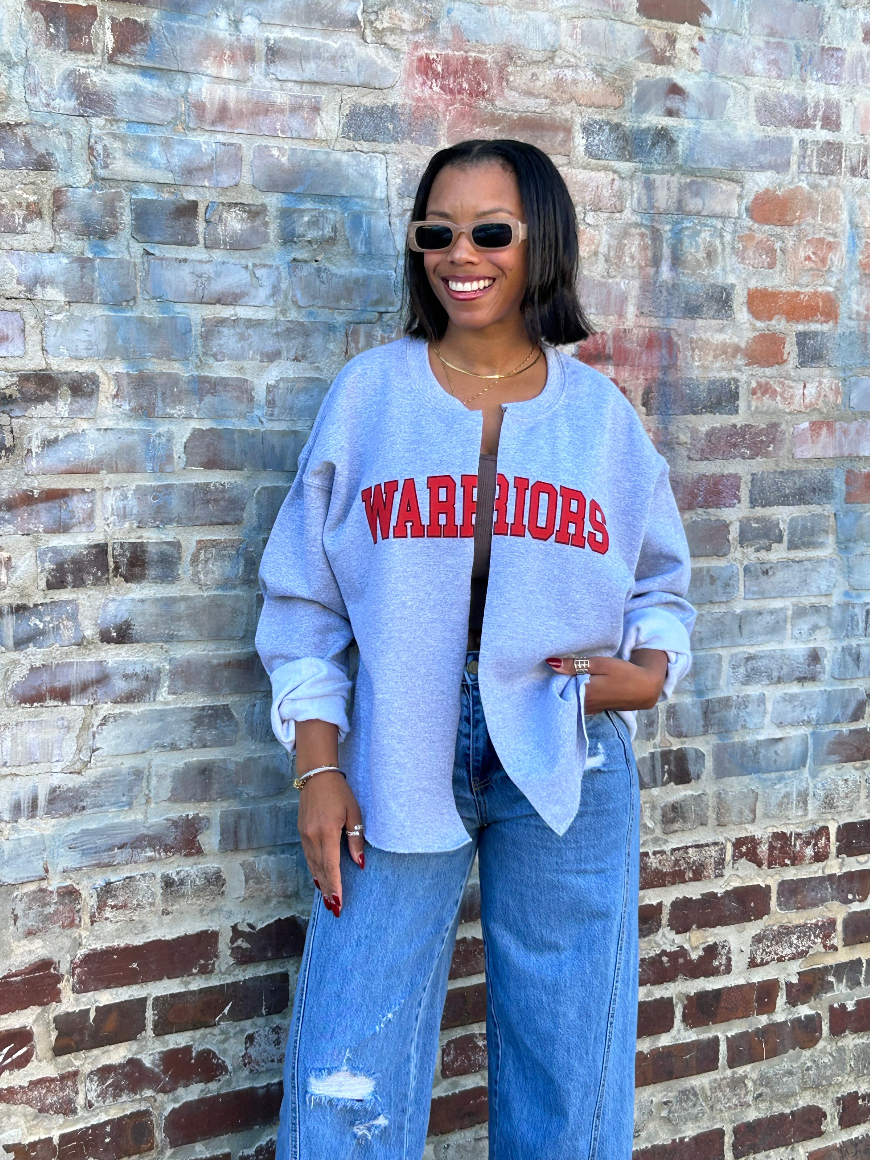 Product form WARRIORS sweatshirt/cardi I would suggest sizing up! Model is wearing a Large in the pic! $39.00 Size S M L XL 2XL 3 in stock Quantity Add to cart